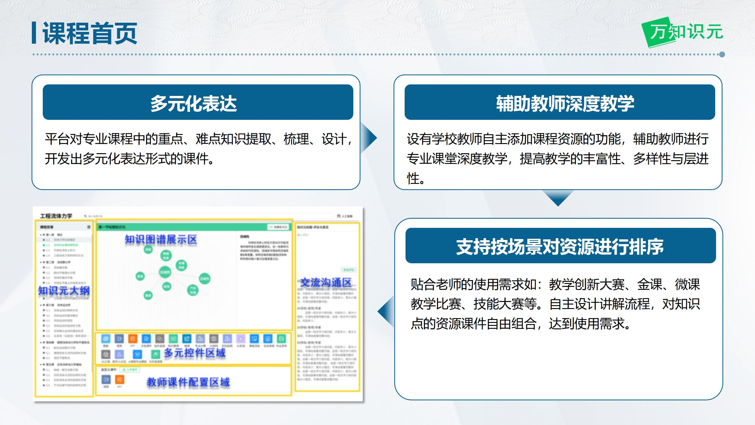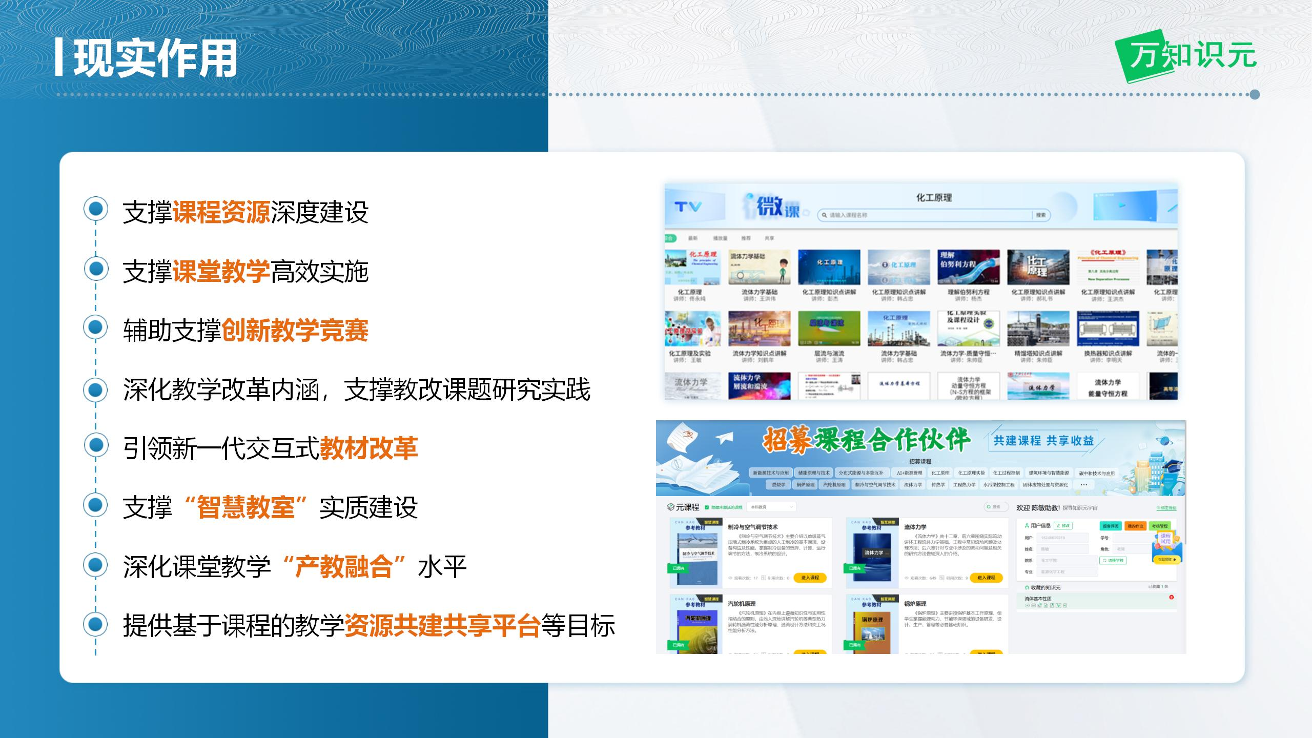 面向化学、化工专业、能源与动力工程、新能源科学与工程、建筑环境与能源应用、机械工程、水利工程、环境工程、给排水科学与工程等数十个理工科专业的课程,对教材进行篇章划分,将重点、难点知识进行提取、梳理、设计,每本教材梳理出约40个知识元,每个知识元的表达形式不低于五种;并设有学校老师自主设计添加课程资源的功能。